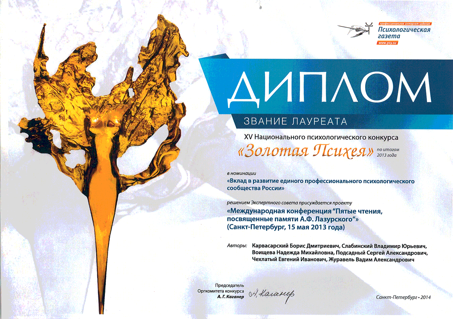 Лауреат XV Национального конкурса «Золотая Психея» по итогам 2013 года в номинации «Вклад в развитие единого профессионального психологического сообщества России» с проектом «Международная конференция «Пятые чтения, посвященные памяти А.Ф. Лазурского» (Санкт-Петербург, 15 мая 2013 года). Авторы: Б.Д. Карвасарский, В.Ю. Слабинский, Н.М. Воищева, С.А. Подсадный, Е.И. Чехлатый, В.А. Журавель.