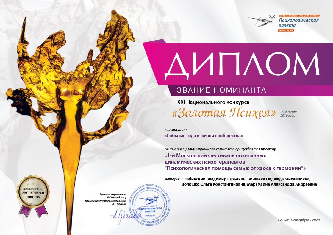 Отмечен экспертами XXI Национального психологического конкурса «Золотая Психея» по итогам 2019 года в номинации «Событие в жизни сообщества» проект «1-й Московский фестиваль позитивных динамических психотерапевтов. «Психологическая помощь семье: от хаоса к гармонии»». Авторы: В.Ю. Слабинский, Н.М. Воищева, А.А. Марамзина, О.К. Волошко.