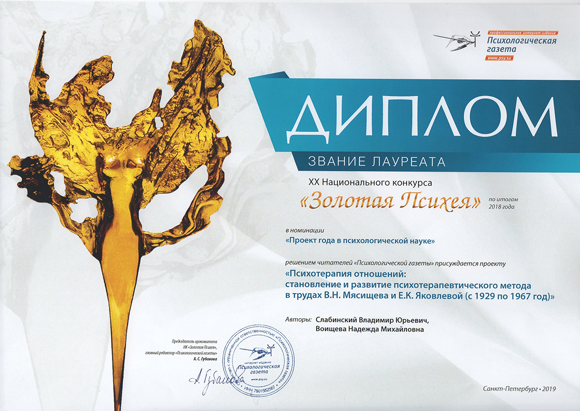 Лауреат XХII Национального психологического конкурса «Золотая Психея» по итогам 2020 года в номинации "Проект года в психологической науке" с проектом «Позитивная динамическая психотерапия - метод, развивающий психологию отношений Лазурского-Мясищева». Авторы: В.Ю. Слабинский, Н.М. Воищева