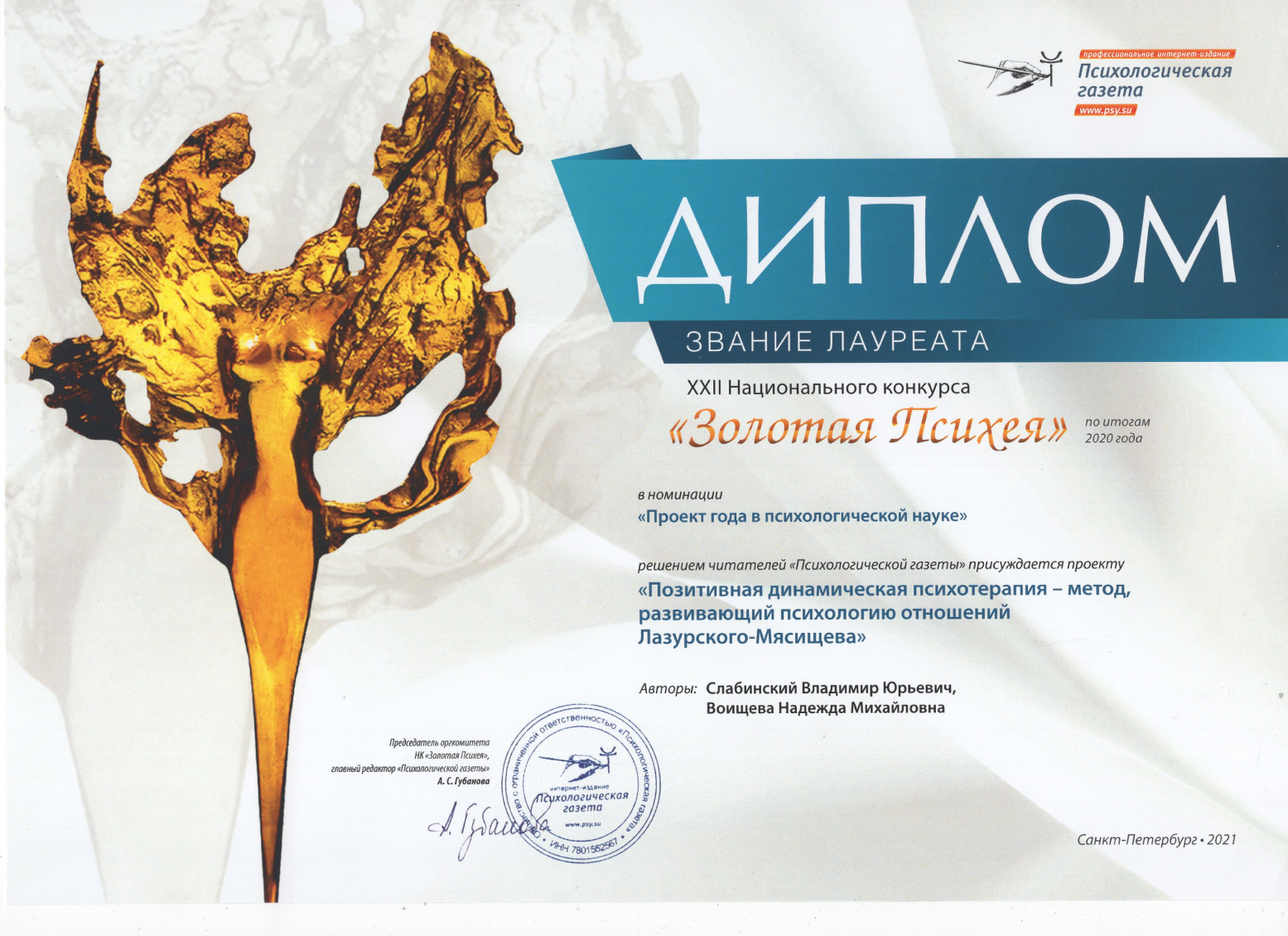 Проекты сотрудников АНО ДПО «Петербургская школа психотерапии и психологии отношений» 8 раз становились лауреатами Национального психологического конкурса «Золотая Психея»