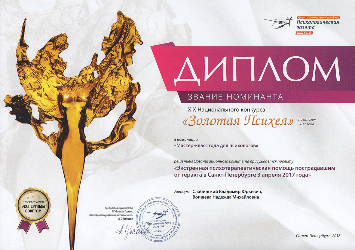 Отмечен экспертами XIX Национального психологического конкурса «Золотая Психея» по итогам 2017 года в номинации «Мастер-класс года для психологов» проект «Экстренная психотерапевтическая помощь пострадавшим от теракта в Санкт-Петербурге 3 апреля 2017 г.». Авторы: В.Ю. Слабинский, Н.М. Воищева.