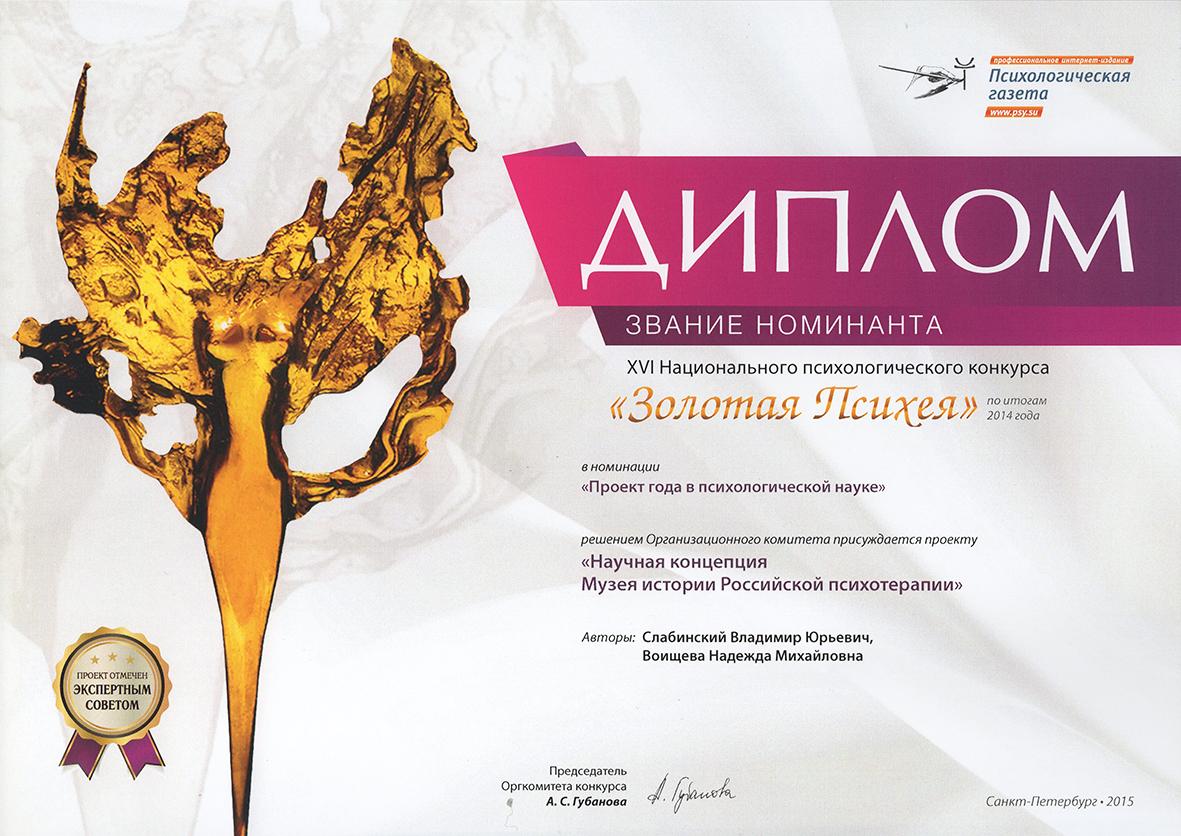 Отмечен экспертами XVI Национального психологического конкурса «Золотая Психея» по итогам 2014 года в номинации «Проект года в психологической науке» проект «Научная концепция Музея истории Российской психотерапии». Авторы: В.Ю. Слабинский, Н.М. Воищева.