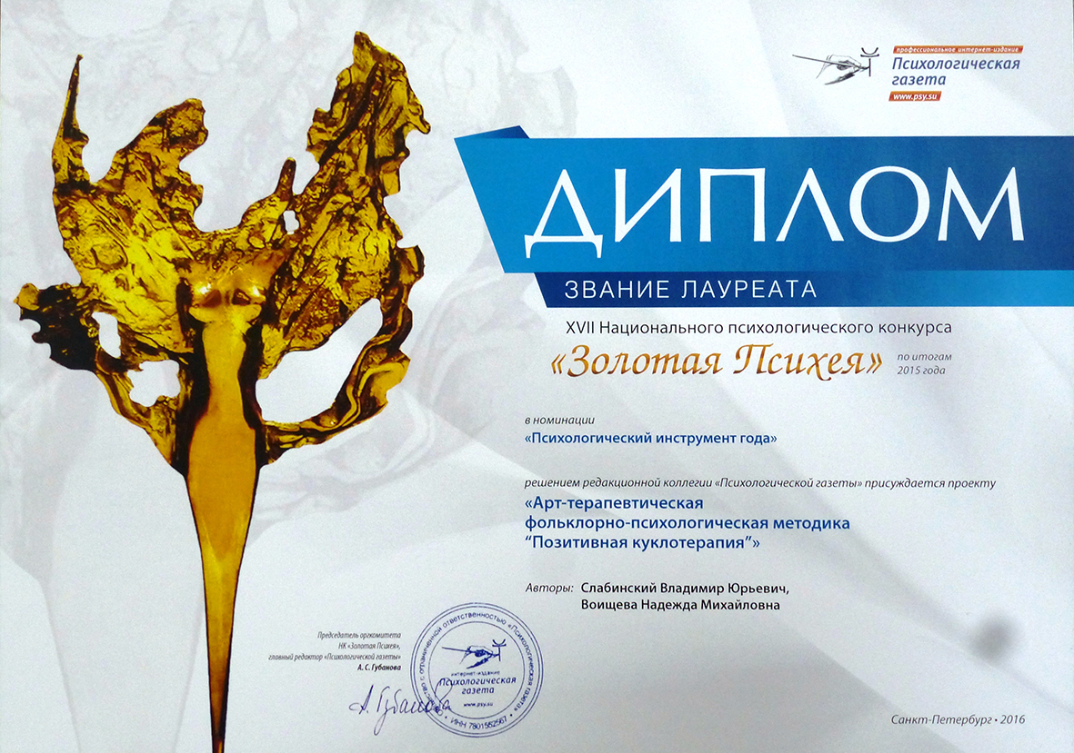 Лауреат XVII Национального конкурса «Золотая Психея» по итогам 2015 года в номинации «Психологический инструмент года» с проектом «Арт-терапевтическая фольклорно-психологическая методика «Позитивная куклотерапия». Авторы: В.Ю. Слабинский, Н.М. Воищева.