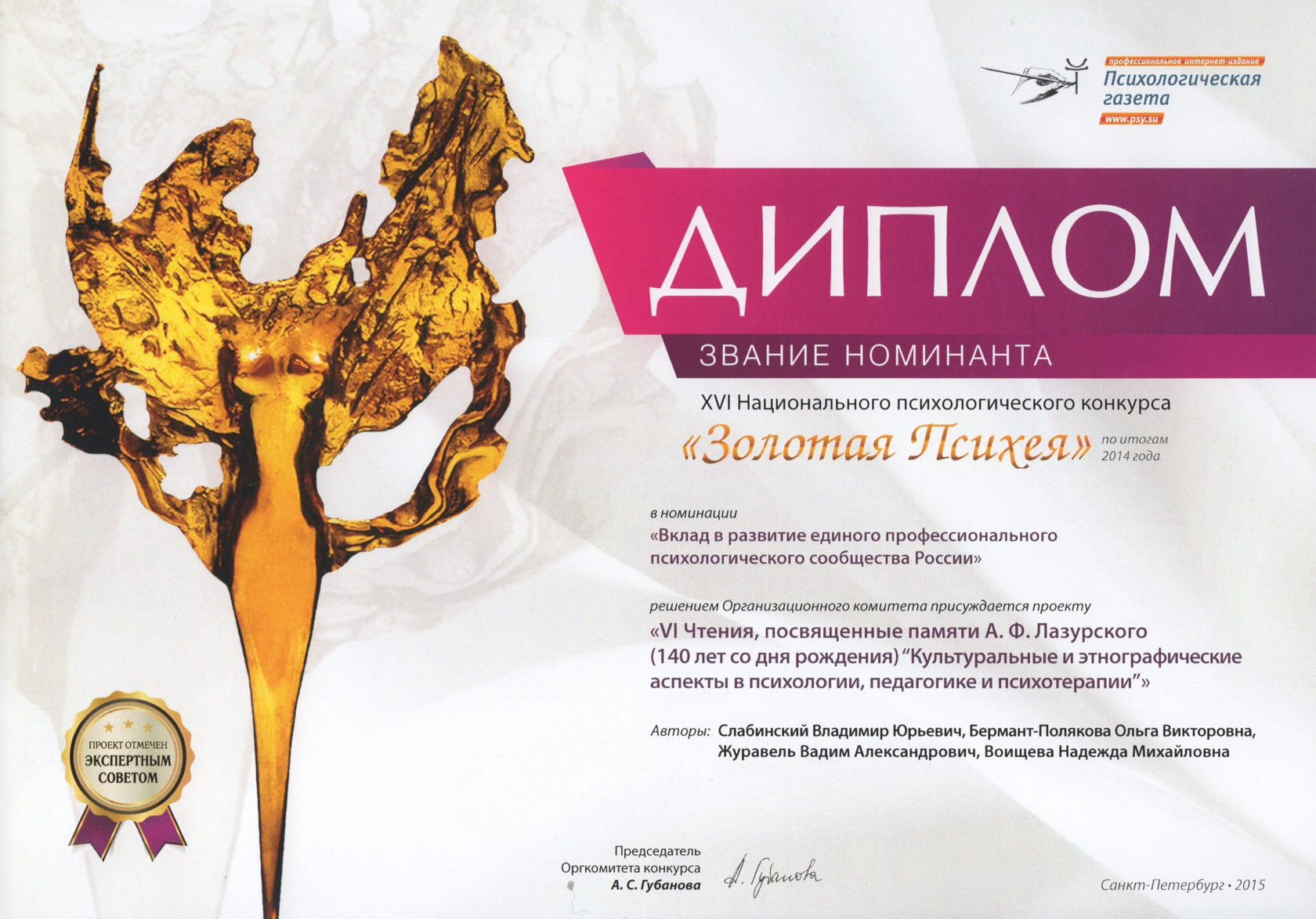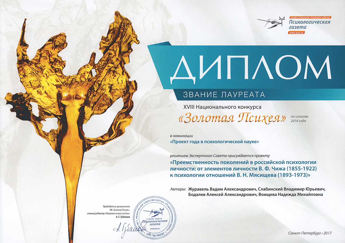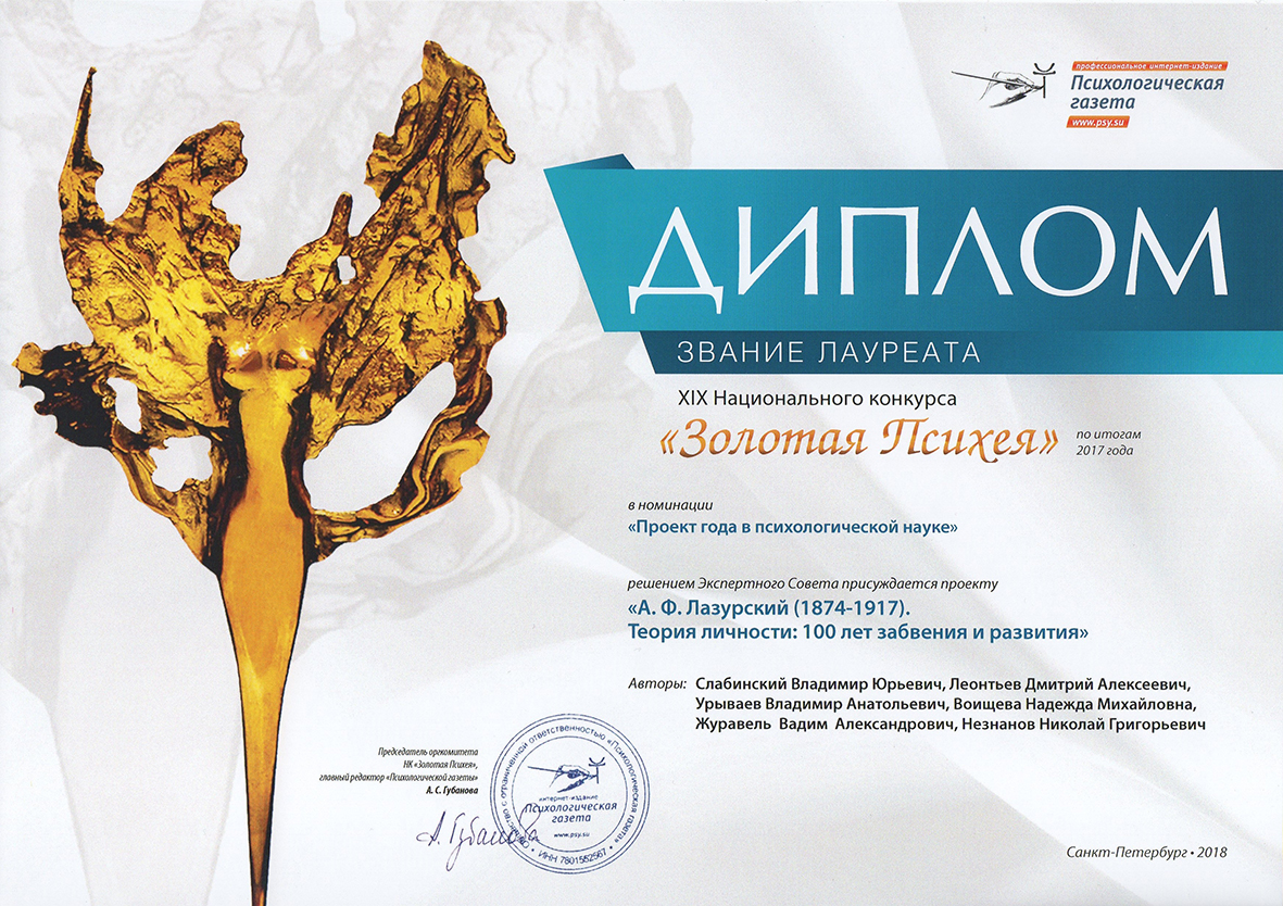 Отмечен экспертами XVI Национального психологического конкурса «Золотая Психея» по итога 2014 года в номинации «Вклад в развитие единого профессионального психологического сообщества России» проект «VI Чтения, посвященные памяти А.Ф. Лазурского (140 лет со дня рождения). «Культуральные и этнографические аспекты в психологии, педагогике, психотерапии». Авторы: В.Ю. Слабинский, О.В. Бермант-Полякова, В.А. Журавель, Н.М. Воищева.