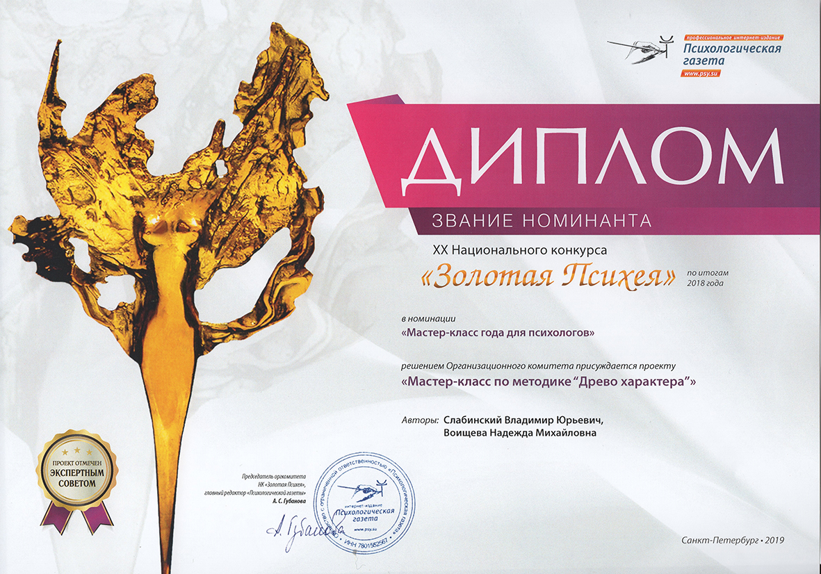 Отмечен экспертами XX Национального психологического конкурса «Золотая Психея» по итогам 2018 года в номинации «Мастер-класс года для психологов» проект «Мастер-класс по методике «Древо характера». Авторы: В.Ю. Слабинский, Н.М. Воищева.