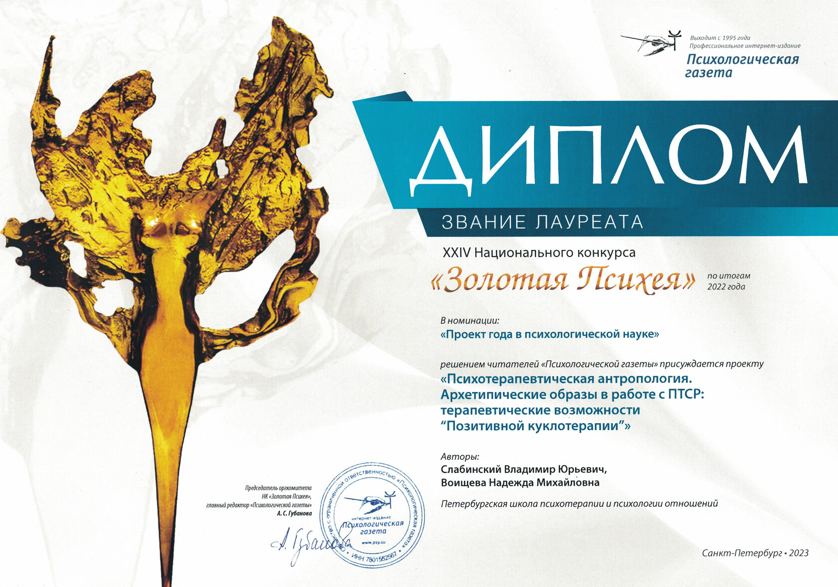 Лауреат XXIV Национального конкурса "Золотая Психея" по итогам 2022 года в номинации "Проект года в психологической науке". Проект "Психотерапевтическая антропология. Архетипические образы в работе с ПТСР: терапевтические возможности «Позитивной куклотерапии»". Авторы: В.Ю. Слабинский, Н.М. Воищева Реферат проекта